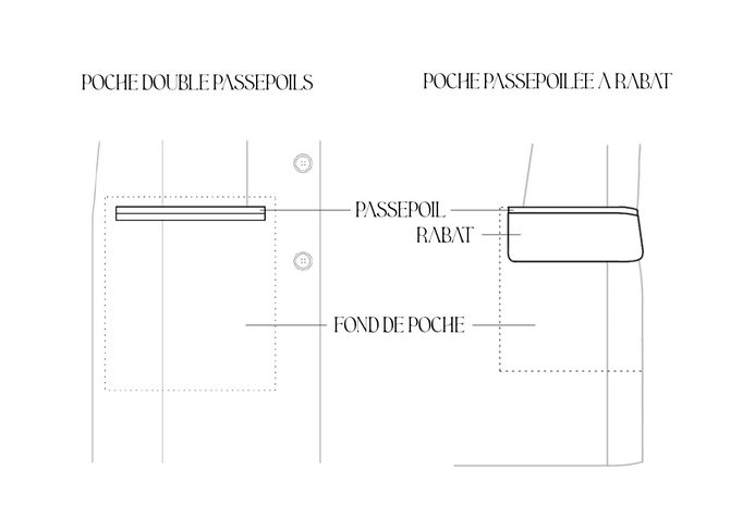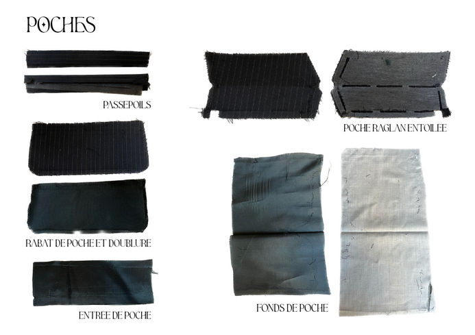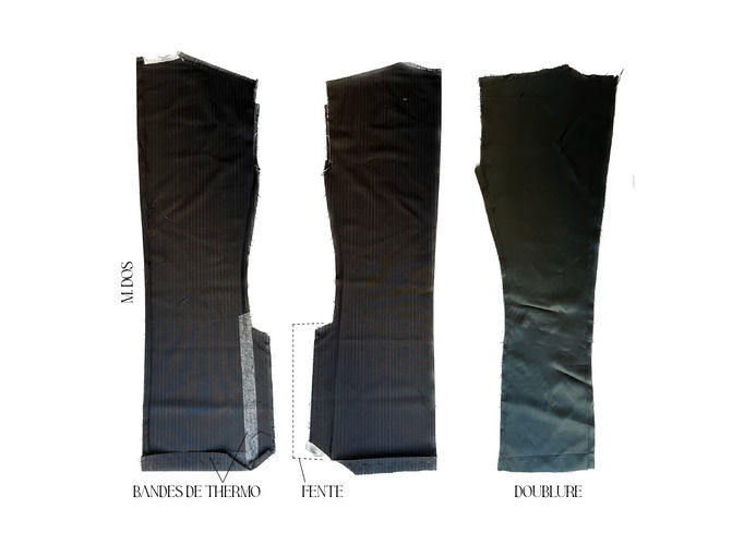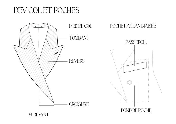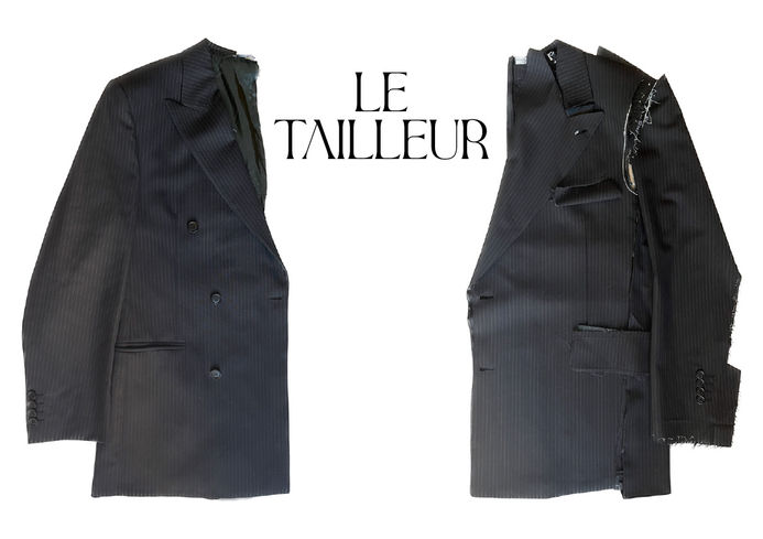 Veste tailleur homme classique trouvée en friperie démontée entièrement sur la moitié du vêtement. DEV devant et dos. Observation et descriptions des éléments col, manche, poches, doublure, entoilages...