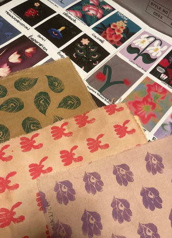 Travail de motifs, couleurs, teinture textile et linogravure pour créer des tampons.